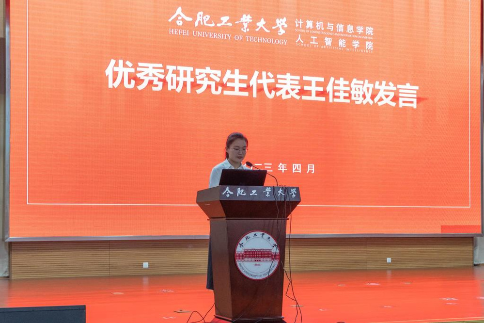 正处级组织员郑荣美宣读了风云体育 2021-2022学年先进个人表彰决定。国家奖学金获得者、安徽省优秀毕业生、计算机科学与技术2020级硕士研究生王佳敏作为学生代表发言,她结合个人经历,号召同学们要以理想照亮前行的路,以奋斗书写青春答卷,以吃苦锤炼过硬本领,以担当彰显初心使命,做“眼中有光”、“脚下有路”、“手上有招”、“肩上有责”的新时代好青年。