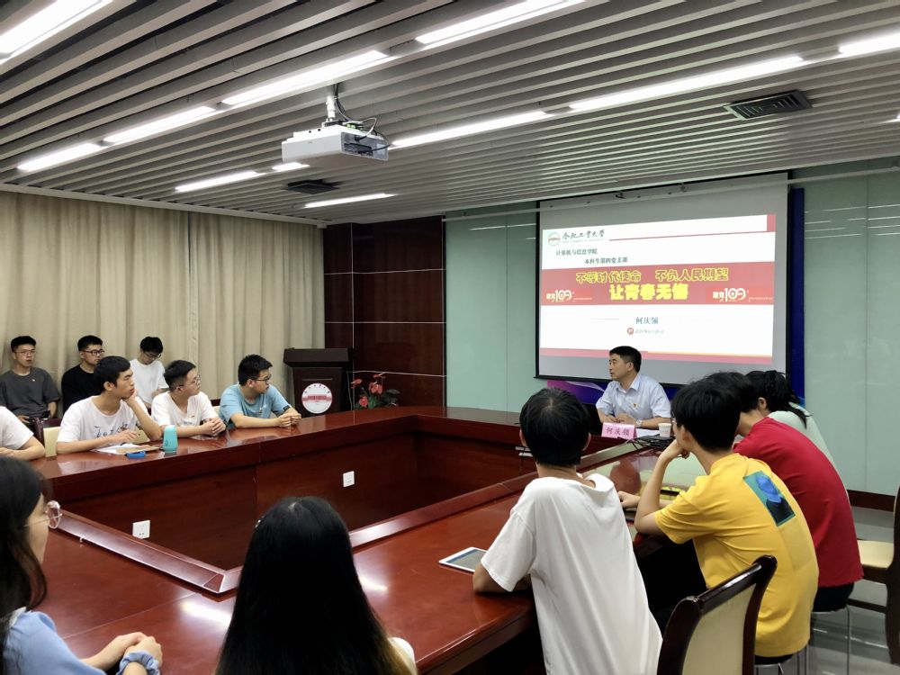 为迎接建党100周年,扎实开展党史学习教育,落实合肥工业大学《关于党员领导干部联系基层党支部工作的通知》要求。6月28日19点在翡翠科教楼A1106会议室,资产经营有限公司纪委书记、副总经理何庆领深入学院本科生第四党支部开展联学导学。