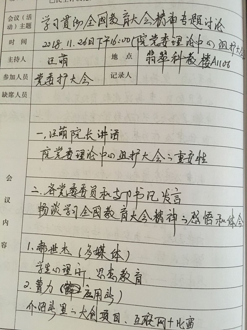 首先,汪院长强调了院党委卢纶中心组扩大会议的重要性,强调了习近平总书记在教育大会上的讲话对学院工作发展的指导性作用。而后,各党委委员和各党支部书记畅谈了学习全国教育大会精神的感悟和体会。多媒体所党支部书记郝世杰提出学生心理和思想教育的重要性,应用所党支部书记曹力提到学生创新能力培养的重要性,信号所党支部张海燕提出教师不忘初心增加与学生交流的重要性。会议讨论积极热烈,对习近平总书记的讲话精神有了更深入的认识。
