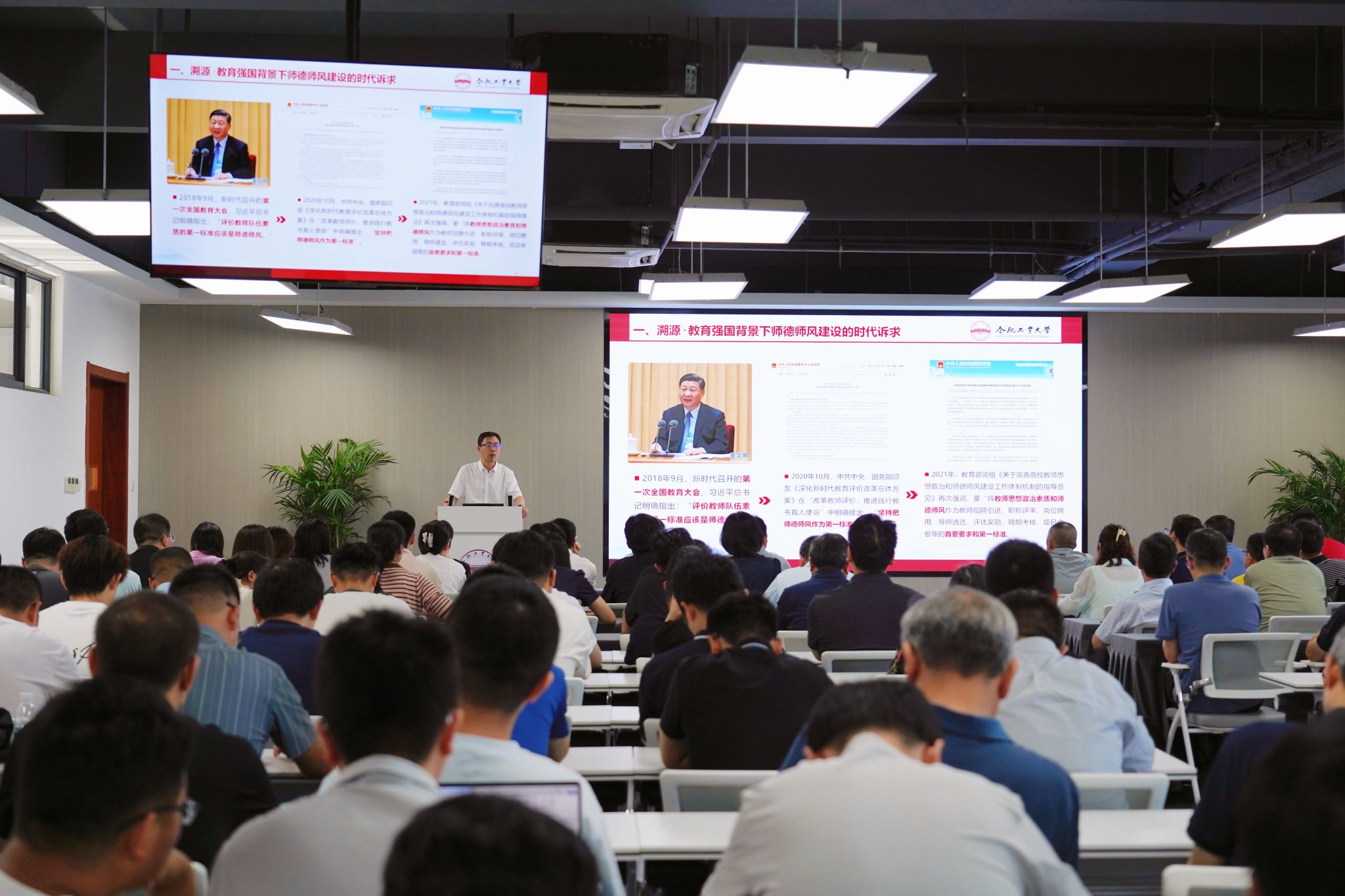 7月2日下午,校党委副书记胡笑旋面向学院全体教师及新发展党员,作题为“培根铸魂、启智润心以身示范争做新时代‘大先生’”的专题报告。学院党委书记年永琪主持会议。