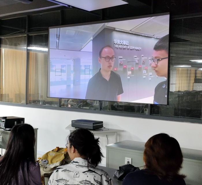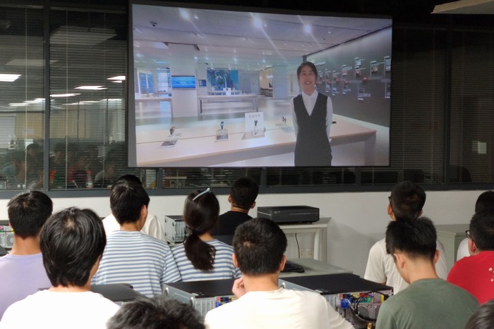 在学校侧,学院两位教师作为校内组织员,带领同学们在直播大厅,采用5G接收设备和大尺寸屏幕,全程观看了企业负责人的介绍,让同学们对可穿戴设备的技术现状有了全面了解,对该行业的发展有了一定的认识,同时对涉及到的专业知识有了进一步的理解。在交流互动环节,大家就华米公司的人工智能技术、人才招聘需求等进行了问答。