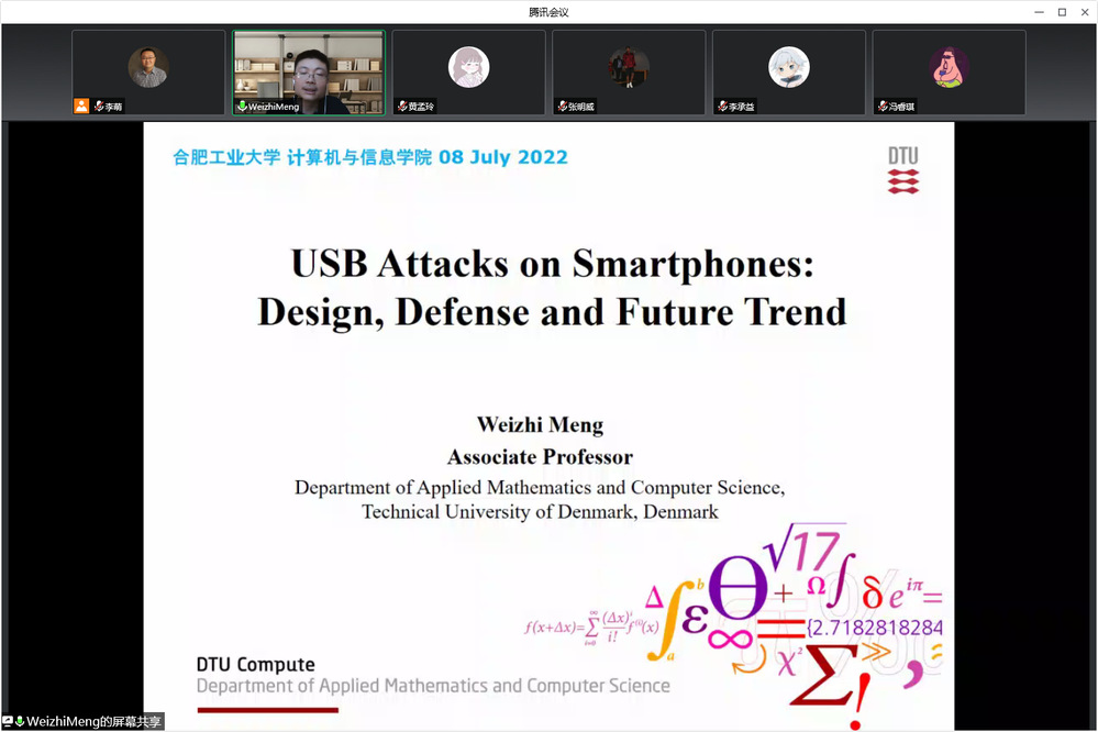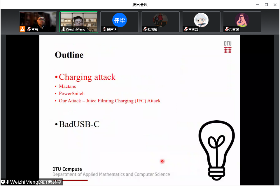 在报告会上,Meng博士介绍了哥本哈根、丹麦科技大学和应用数学与计算机科学学院的基本情况,也介绍了其团队的最新科研成果,包括手机充电攻击和BadUSB-C攻击。Meng博士也对当前智能手机安全的主要挑战和公开问题进行了讨论。在报告会结束后,线上师生和Meng教授进行了深入交流。