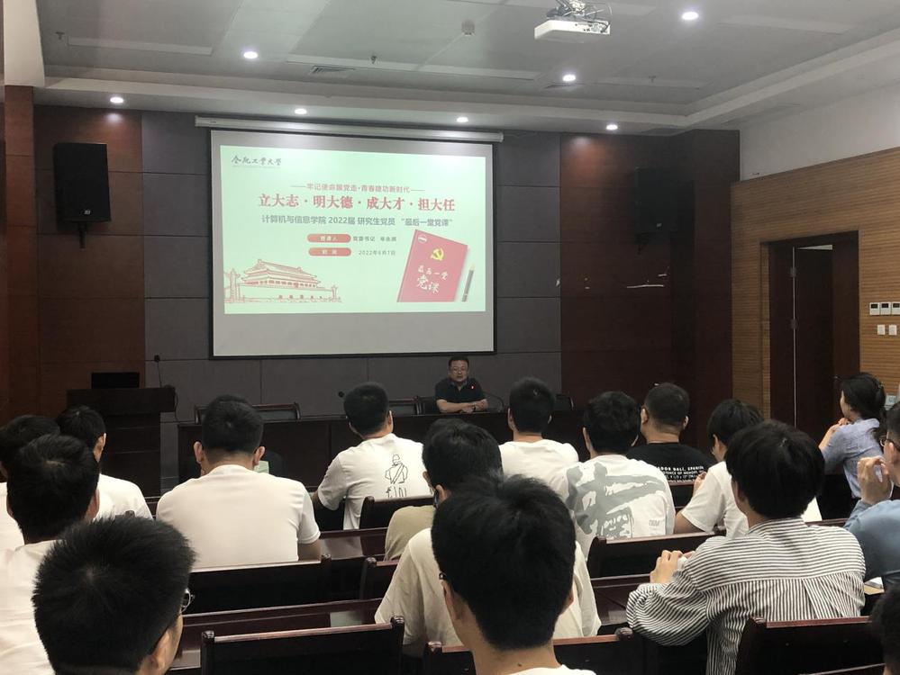 会上,年永琪首先对毕业生的顺利毕业表达了祝贺,并预祝大家在今后的工作中取得更好的成绩。随后,他与毕业班党员分享了自己入党22年的心得感悟和工大20年的工作经验,并提出殷切希望。年永琪指出,作为一名工大人和计算机学子,首先政治立场要坚定,要始终牢记自己的党员身份,保持纯洁性和先进性。在校自觉遵守学校管理,在外严格接受社会公德法律的约束,做立大志、明大德、成大才、担大任的新时代青年。从工作和生活两个角度出发,年永琪向在场党员学生提出两点建议:一是不说狂言诳语。入职初期少说话多看多听,后期该说的时候再说。二是拒绝精致利己。牢记党员的先锋带头作用,严格要求自己。最后,年永琪寄语毕业生党员弘扬工大人的优良作风,以积极饱满的热情去迎接人生的下一个阶段。