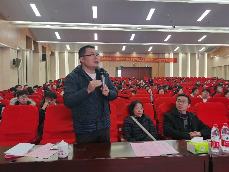 2021年研究生学术交流年会。计算机学院党委书记年永琪,副院长洪日昌,党委副书记、副院长张海林,副院长夏娜,软件学院副院长薛峰出席年会,特别邀请中国科学技术大学李厚强教授、合肥中科类脑智能技术有限公司邵梦副总经理作报告,路强副教授、吴克伟副教授等十余位青年教师及700余名研究生参加大会。