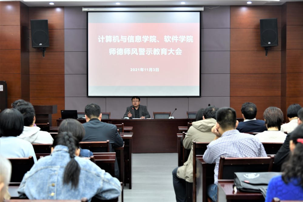 、软件学院在翡翠科教楼第五会议室召开师德师风警示教育大会,学院全体教职工参加了本次大会,学院党委书记年永琪主持会议。