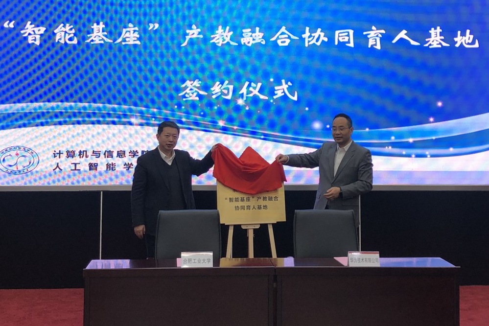 最后,合肥工业大学党委副书记陈刚与华为技术有限公司副总裁郑叶来代表校企双方为“智能基座”产教融合人才基地揭牌;合肥工业大学本科生院院长陈翌庆与华为上海研究所所长董庆阳共同签署了项目协议。会后,双方代表围绕项目合作内容进行了进一步交流和讨论。