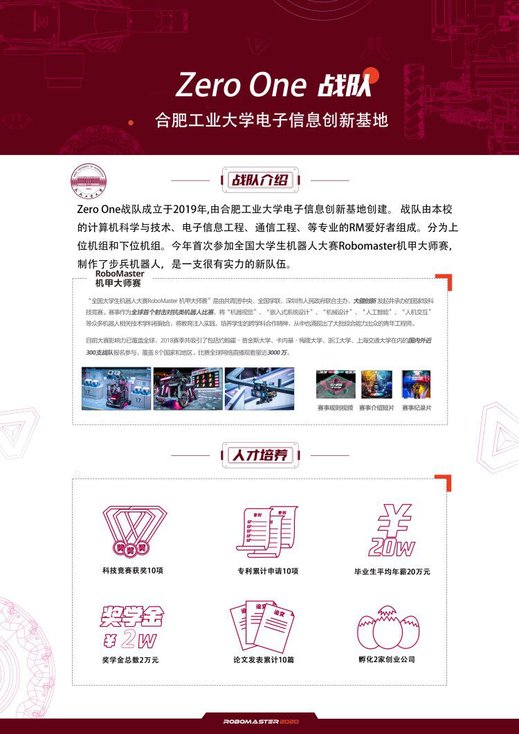 Zero One战队成立于2019年,今年首次参加到全国大学生机器人大赛RoboMaster机甲大师赛事当中,依托于合肥工业大学电子信息创新基地。战队由本校计算机科学与技术、电子信息工程、通信工程、微电子、机械工程等专业的RM爱好者组成。战队分为上位机组、下位机组和机械组。今年在风云体育