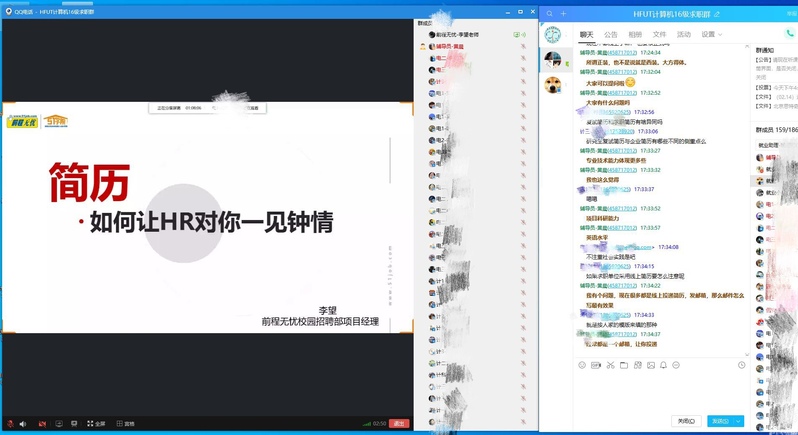 为深入贯彻落实教育部和学校有关疫情防控工作安排,做好疫情防控期间的毕业生就业工作,学院对2020届有求职意愿毕业生群体进行深入调研,在2月17日下午4点,通过信息化线上语音以及屏幕共享方式开展第一场就业指导系列空中讲座——简历,如何让HR对你一见钟情。讲座在学院毕业生求职群里发起,由毕业班辅导员黄晨老师主持,前程无忧校园招聘部高级讲师李望担任主讲。