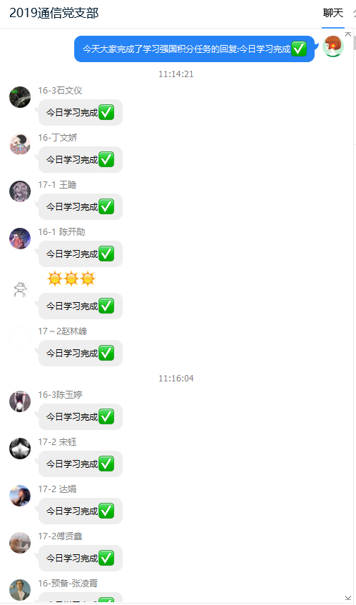 视频会议中,党支部书记对全体党员还提出特殊时期新要求,要求全体党员需要与祖国的千千万万党员心连心,主动担当,切实发挥学生党员的先锋模范作用。为此,对2017级党员进行党员责任分区,每位党员负责学院部分同学的健康打卡工作,更重要的是优秀党员来进行生活学习帮扶,让党员同志能够肩负起时代赋予的使命与责任,在抗击新冠肺炎疫情斗争阶段作出自己的一份贡献。