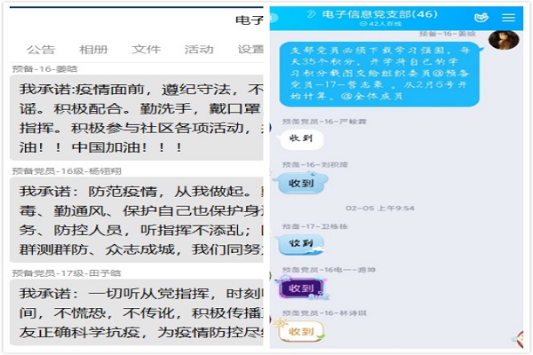 2月17日支部通过QQ语音组织召开支部委员会,支部书记叶璟主持此次会议。会议上再次学习《合肥工业大学关于严肃新型冠状病毒疫情防控工作纪律的通知》要求,着重强调了作为党员要以高要求约束自己,带头执行中央部署,带头做好防控工作,带头落实学校要求,带头进行科学防控。会后支委通过党小组会向支部党员强调疫情期间的相关纪律要求。支部成员在支部群中纷纷承诺:“疫情防控期间会严格遵守纪律,积极履行党员义务,起到先锋模范作用。”