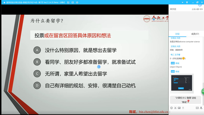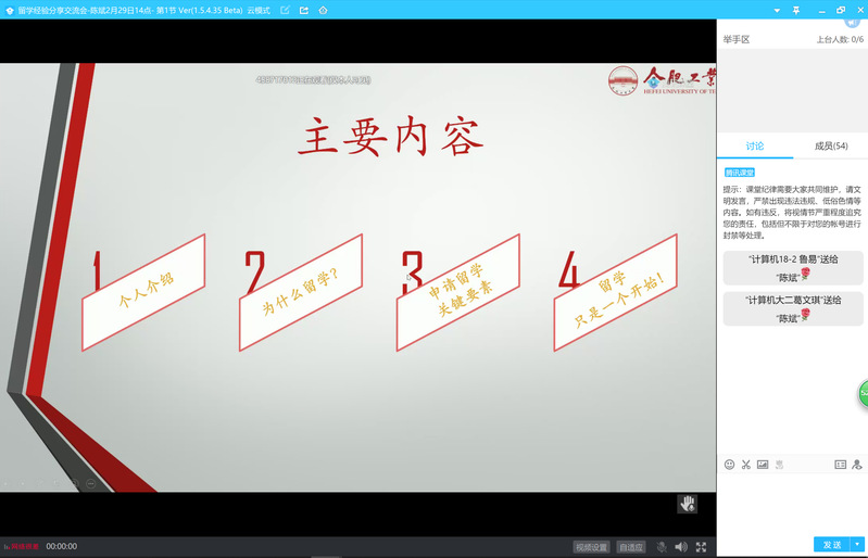 为落实国家和学校关于做好新冠肺炎疫情防控期间就业工作的决策部署,落实就业精准帮扶,2月28日14时,学院在腾讯课堂平台成功举办留学经验空中分享会。分享会邀请信息与信号处理研究所硕士生导师陈斌(2006级本科生)作主讲人,在云端为同学们分享他留学的相关经验和心得体会。近百名同学参与分享会线上课堂,其中47名有留学意向的学生全程在线,进行互动交流。