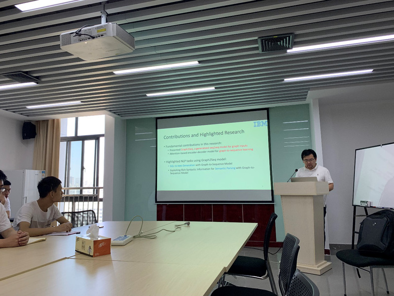 在报告会上,吴凌飞博士首先介绍了自然语言处理中Seq2Seq技术的发展及其局限性。随后,吴凌飞博士主要介绍了其研究团队提出的Graph2Seq模型。Graph2Seq可以看作是一个广义的图输入Seq2Seq模型,它是一种通用的端到端的神经编解码器结构,它对输入图进行编码,并对目标序列进行解码。在本次讲座中,吴凌飞研究员首先介绍Graph2Seq模型,然后讨论如何在不同的NLP任务中应用该模型。报告会结束后,在座师生就感兴趣的话题和吴凌飞博士进行了深入交流。