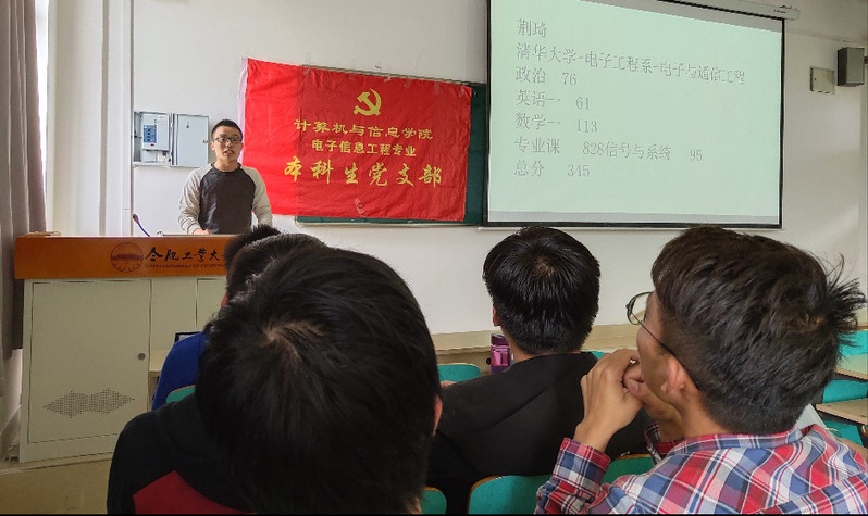 电子信息工程专业党支部在翡翠湖校区教学楼举办了“学长学姐经验交流会”活动。活动邀请了2015级电信工专业的荆琦、杨佳宇、谭鑫凯、柯春青、高光远五位优秀学生党员与大三年级本科生进行了面对面的交流。