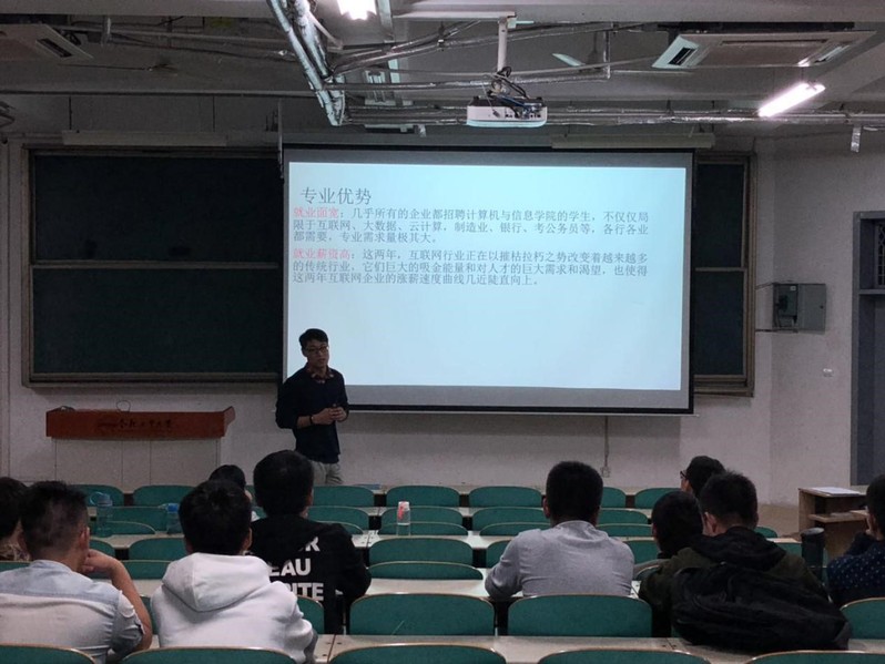会议开始,刘世国老师结合当前的就业形势和计算机学院就业情况,强调在经济全球化的大背景之下,美国悍然发动贸易战,造成国际就业形势严峻,中国也受到一定影响;今年应届毕业生人数再创历史新高,使得就业形势十分严峻。但同时计算机相关专业的学生具备就业面广的优势,加之互联网公司的巨大吸金能力和对人才的巨大需求,使得计算机相关专业的人才非常抢手,鼓励大家增强信心。