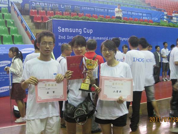 另讯,“三星杯”第二届国际仿人机器人奥林匹克大赛于7月28日至29日在牡丹江海林体育馆举行。来自中国、美国、日本、韩国等六个国家和地区37所高校的300多名师生参加了该项赛事。我校获得类人型单人舞蹈比赛亚军,获得类人型双人舞蹈和阶梯跑二等奖、类人型1VS1击剑、类人型1vs1拳击三等奖。其中类人型单人舞蹈是在前面全国赛的经验积累下,参赛队员经过2天的不懈努力,重新选择音乐和组织编排舞蹈动作而获得的优异成绩。