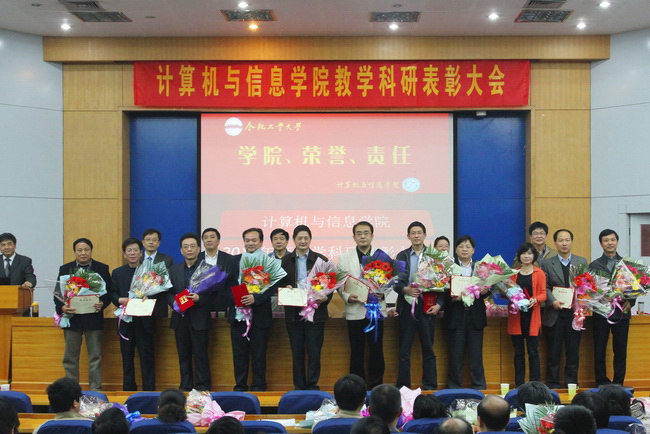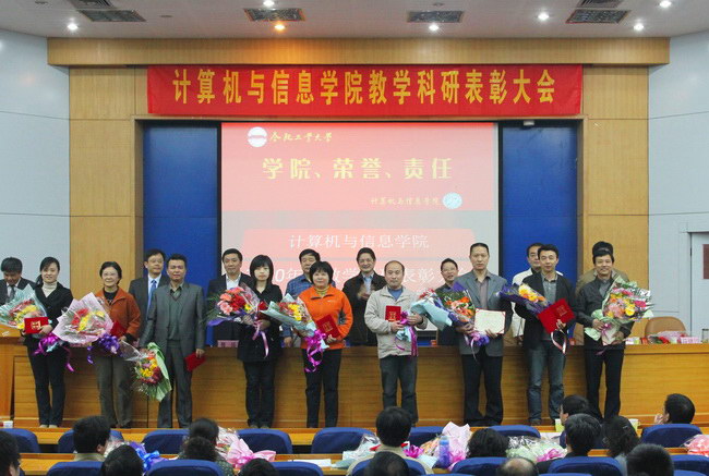 大会对2010年度科研项目纵向到账经费50万以上、横向到账经费100万以上的个人授予了“2010年度承担科研项目个人优秀奖”;对2010年度学生评教中综合排序前二十名的个人授予了“2010年度学生评教个人优秀奖”。会上,学院分党委书记蒋建国作了发言,提出了“职业当事业”的理念;教务处张辉处长发言指出教学科研工作要取得成绩,贵在“坚持”,并结合计算机专业认证工作进行了工作动员和布置;科研院科学研究处处长徐进章对学院过去一年的科研工作进行了肯定,并对年轻教师寄予厚望。