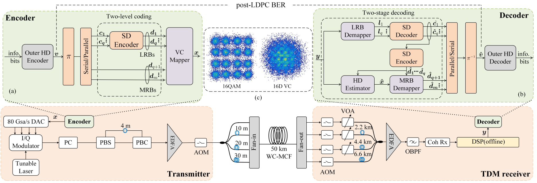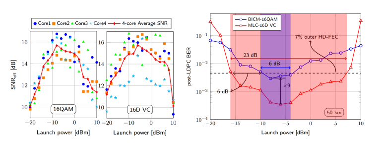 师生本次获得的高分论文“Experimental Demonstration of 16D Voronoi Constellation with Two-Level Coding over 50km four-Core Fiber”,针对未来基于多芯光纤技术的扩容优势和挑战,提出了一种基于16维联合编码调制(MLC-16DVC)的多芯光纤传输方法(如图1所示)。经过单跨50公里四芯光纤传输实验验证(传输实验系统如图2所示),相较于传统的二维独立QAM调制,所提出方法可以容忍更大的芯间信噪比差异影响,并在外级联硬判决纠错容限处可提供6dB的光功率增益(如图3所示)。