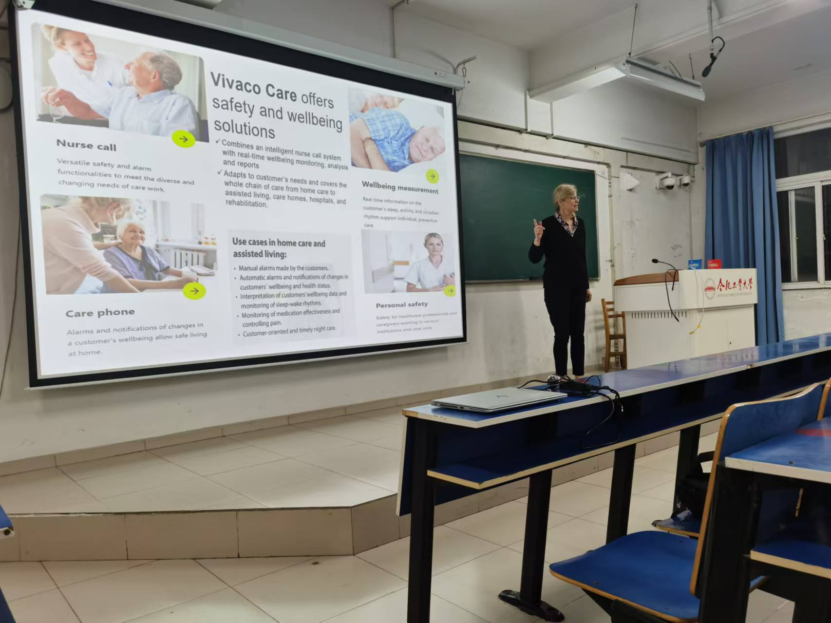 课堂上,Päivi Haho博士介绍了Evondos自动化药物分发系统和Suvanto Care远程安全监测系统,展示了这些智能养老产品在保障老年人用药安全和居家护理方面的应用成效。Pirjo Vesa博士则讲解了Vivaco Care智能护理系统和MariCare智能检测系统,这些技术可以实现跌倒预防、行为监测及全天候安全报警,显著提升了养老服务的质量。通过实际案例,学生们学习了如何利用智能机器人、健康监测传感器和非穿戴式检测系统等先进技术来提升老年人的生活独立性和安全性。课上,学生们还与两位教授就Evondos系统的使用感受以及智慧养老领域的未来发展进行了积极讨论。