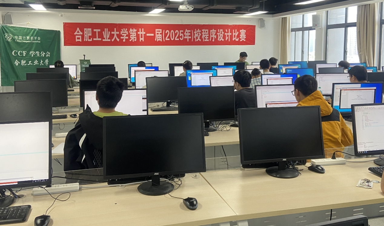 今年的比赛采用现场赛方式进行,时长为3小时,共计6道题目。赛题的解答程序提交后通过自动判题程序进行打分,只有通过每题全部测试数据的提交才算有效提交,否则会被罚时,提交程序的正确与否通过网络由判题系统及时反馈给参赛选手。经过3个小时的紧张比赛,共有45名同学提交满足赛题要求的代码。从中评出一等奖4名,二等奖9名,三等奖14名,具体获奖名单见附件1。本次比赛胜出的同学,将有机会代表学校参加2025年安徽省大学生程序设计竞赛(安徽省机器人大赛-程序设计赛道)和大学生程序设计比赛(ICPC/CCPC)。图1是比赛现场图片报道。
