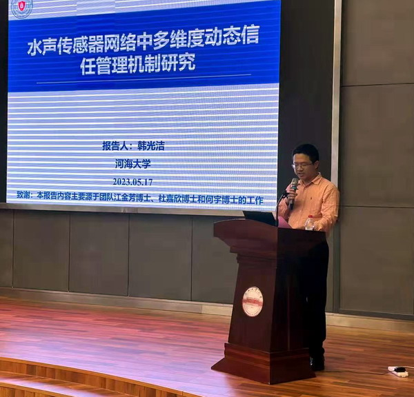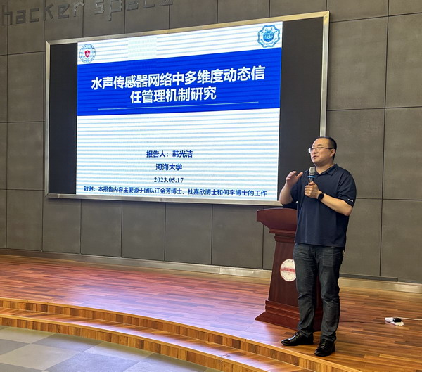 In the report, Professor Han Guangjie focused on the theory and methods of network security in underwater acoustic sensor networks. He introduced the trust management mechanism in underwater acoustic sensor networks, including intrusion detection algorithms based on energy prediction models, multidimensional trust calculation methods based on fuzzy theory, trust evaluation algorithms based on cloud theory, trust cloud migration mechanisms based on AUVs, trust update mechanisms based on reinforcement learning, and anomaly-tolerant trust models based on isolation forests. At the end of the report, Professor Han interacted warmly with the teachers and students, and discussed issues related to network architecture, dynamic trust models, and multimodal heterogeneous networks.