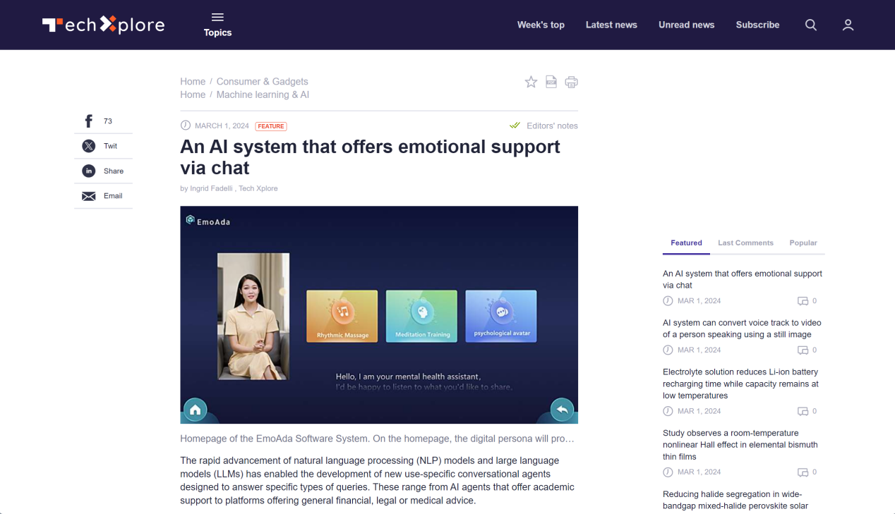 On March 1, 2024, Tech Xplore reported on the development of EmoAda, a multimodal affective interaction system, by Professor Sun Xiao's team from the School of Computer and Information Science. Tech Xplore is a news department under the Science X Network, which primarily covers cutting-edge developments in engineering, electronics, and technology. Science X is a high-quality news media platform that provides daily science, research, and technology news. With a broad readership of up to 5 million globally monthly, it includes scientists, researchers, engineers, and more.