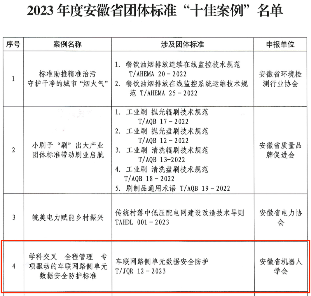 Recently, the Anhui Provincial Market Supervision Administration and the Civil Affairs Department of Anhui Province jointly issued the "Notice on the Announcement of Typical Cases of Group Standards in Anhui Province for the Year 2023" (Wan Shi Jian Han [2024] No. 298). The group standard (T/JQR 12-2023, Data Security Protection for Roadside Units in Connected Vehicles) reported by Professor Hu Donghui's team from the School of Computer and Information at Hefei University of Technology, under the auspices of the Anhui Robot Society, has been honored as one of the "Top Ten Cases" among the typical cases of group standards in Anhui Province for the year 2023.