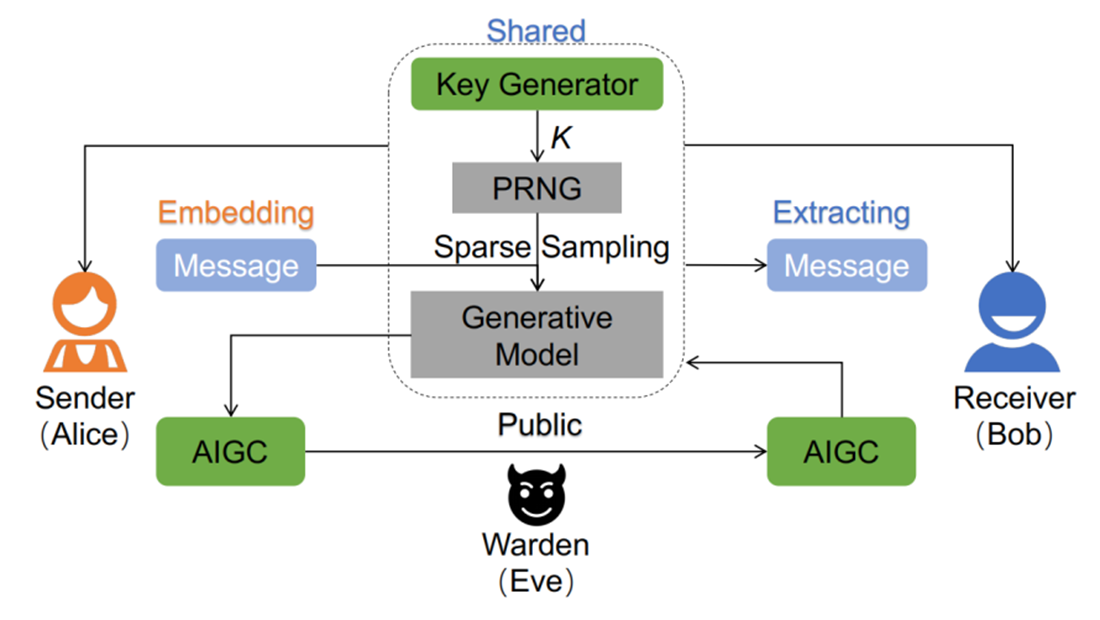 Recently, Associate Professor WANG Yaofei from our school proposed a provably secure steganographic technique, SparSamp, which has been accepted by USENIX Security 2025, one of the top conferences in Computer Security. The goal of SparSamp is simple: to turn AI-generated content (AIGC, such as DeepSeeks responses or AI-generated artwork) into a natural "safe box" for information while ensuring maximum security, speed, and storage capacity during the hiding process.