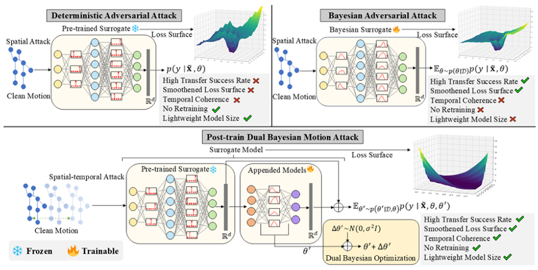 For the first time, this study systematically investigates the adversarial transferability of 3D action recognition models from the perspective of loss landscape smoothness. We propose a dual Bayesian optimization algorithm to enhance surrogate model smoothness while leveraging temporal motion gradients, significantly improving attack transferability. Our method successfully bypasses black-box, white-box, and multiple defense mechanisms, setting a new benchmark in adversarial robustness research.